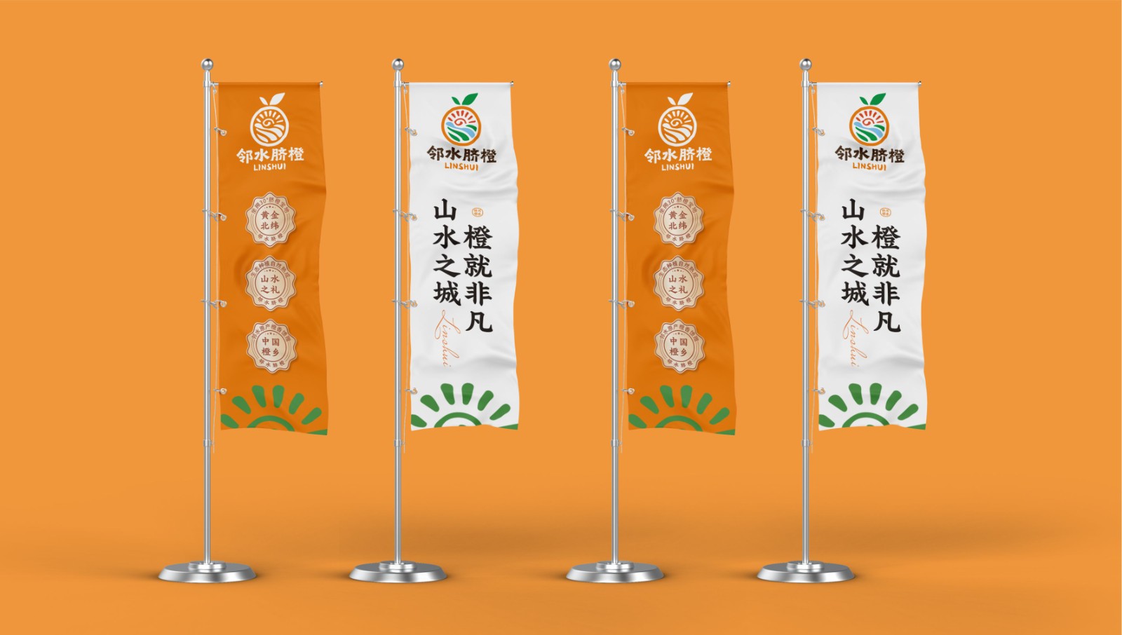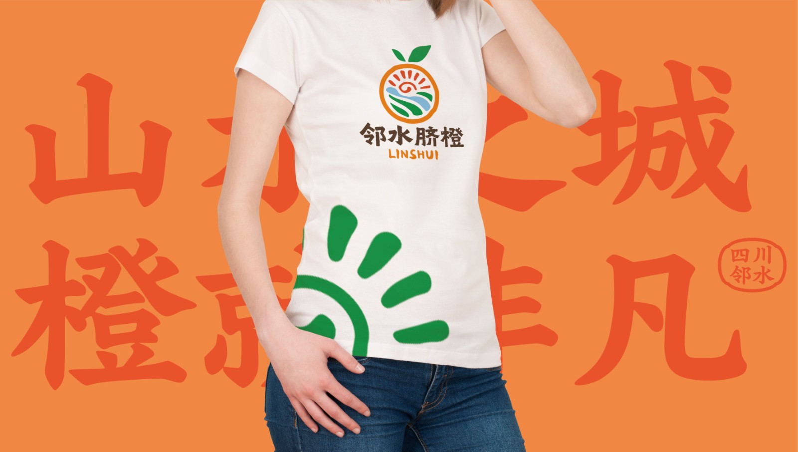 LOGO设计说明:LOGO以一枚饱满的脐橙外形,凝练展现邻水“山水之城”的地理精髓。顶部太阳与明月山构成“日月同辉”,象征充足光照与天地眷顾;左下方华蓥山与铜锣山层叠而立,勾勒地形骨架,喻示品牌坚实根基;中心大洪河与御临河蜿蜒流淌,生动诠释“邻水”之名,代表水源对甘甜果肉的滋养。整套设计将阳光、山峦、河流等自然禀赋融为一体,最终凝聚为这枚“黄金果实”,彰显其作为风土精华的独特价值。图形语言极简而意蕴深厚,确保各类媒介的清晰辨识与强大记忆点,具备成为经典品牌符号的广泛传播潜力。
